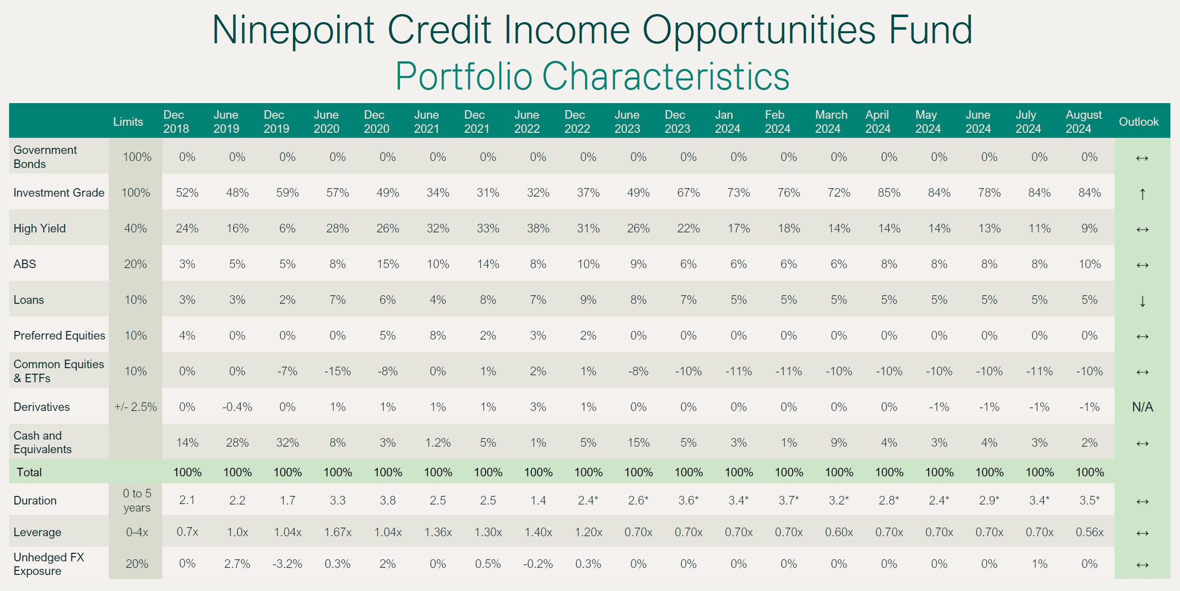 Performance in August was +58 basis points, putting YTD returns at 6.82%. Our defensive positioning remains intact and we continue to recycle maturities into the new issue market where we see value. Examples include CGI and George Weston in the first week of September as they came in an attractive part of the curve in addition to a cheaper valuations. Leverage ticked down modestly on the month as we gear the fund up for what is typically a busy fall new issue market. As of month end, yield-to-maturity stood at 6.7% while duration was 3.5 years.