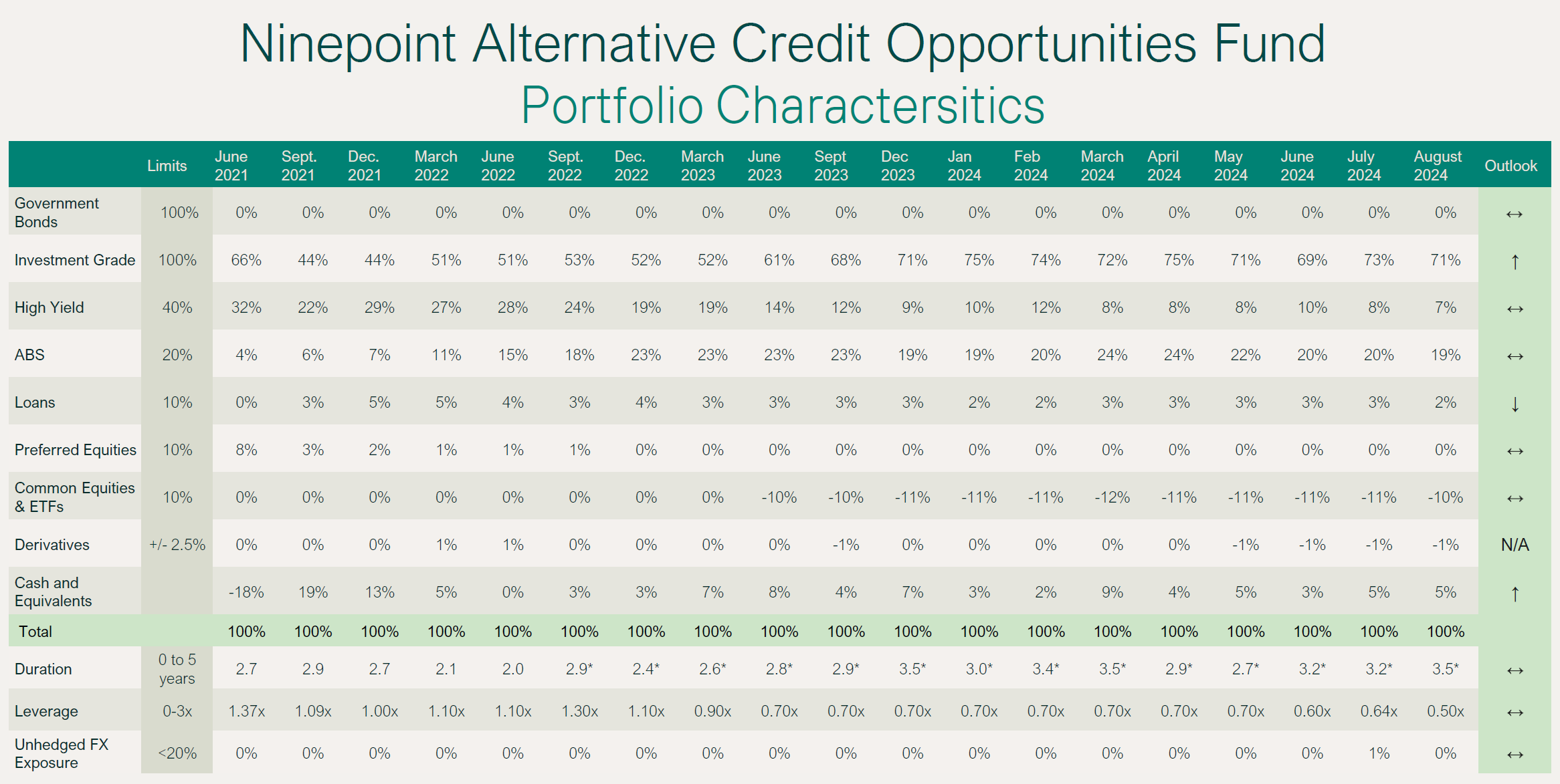 Performance in August was +58 basis points, putting YTD returns at 6.82%. Our defensive positioning remains intact and we continue to recycle maturities into the new issue market where we see value. Examples include CGI and George Weston in the first week of September as they came in an attractive part of the curve in addition to a cheaper valuations. Leverage ticked down modestly on the month as we gear the fund up for what is typically a busy fall new issue market. As of month end, yield-to-maturity stood at 6.7% while duration was 3.5 years.