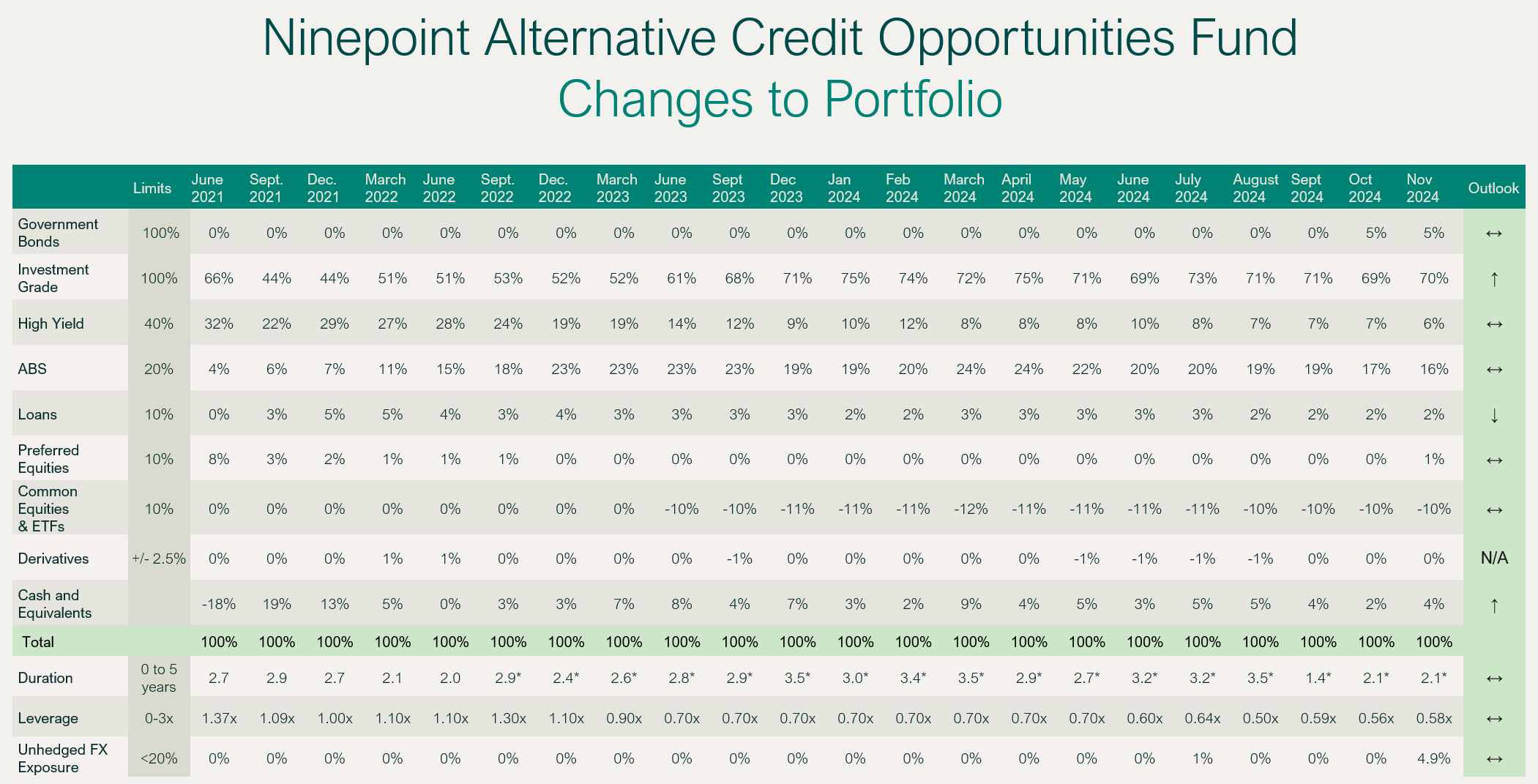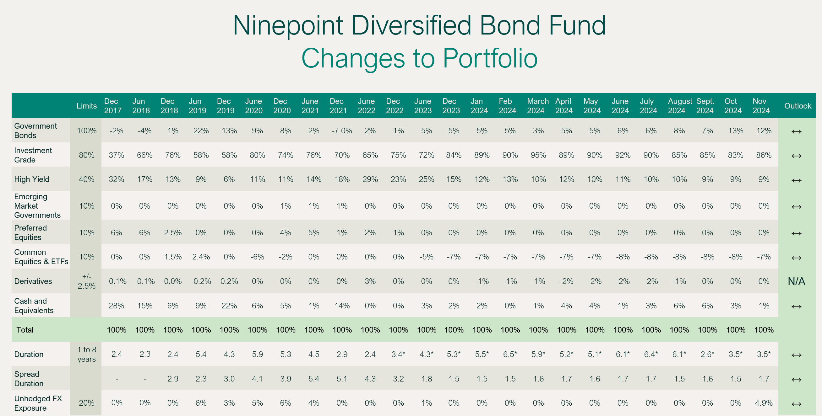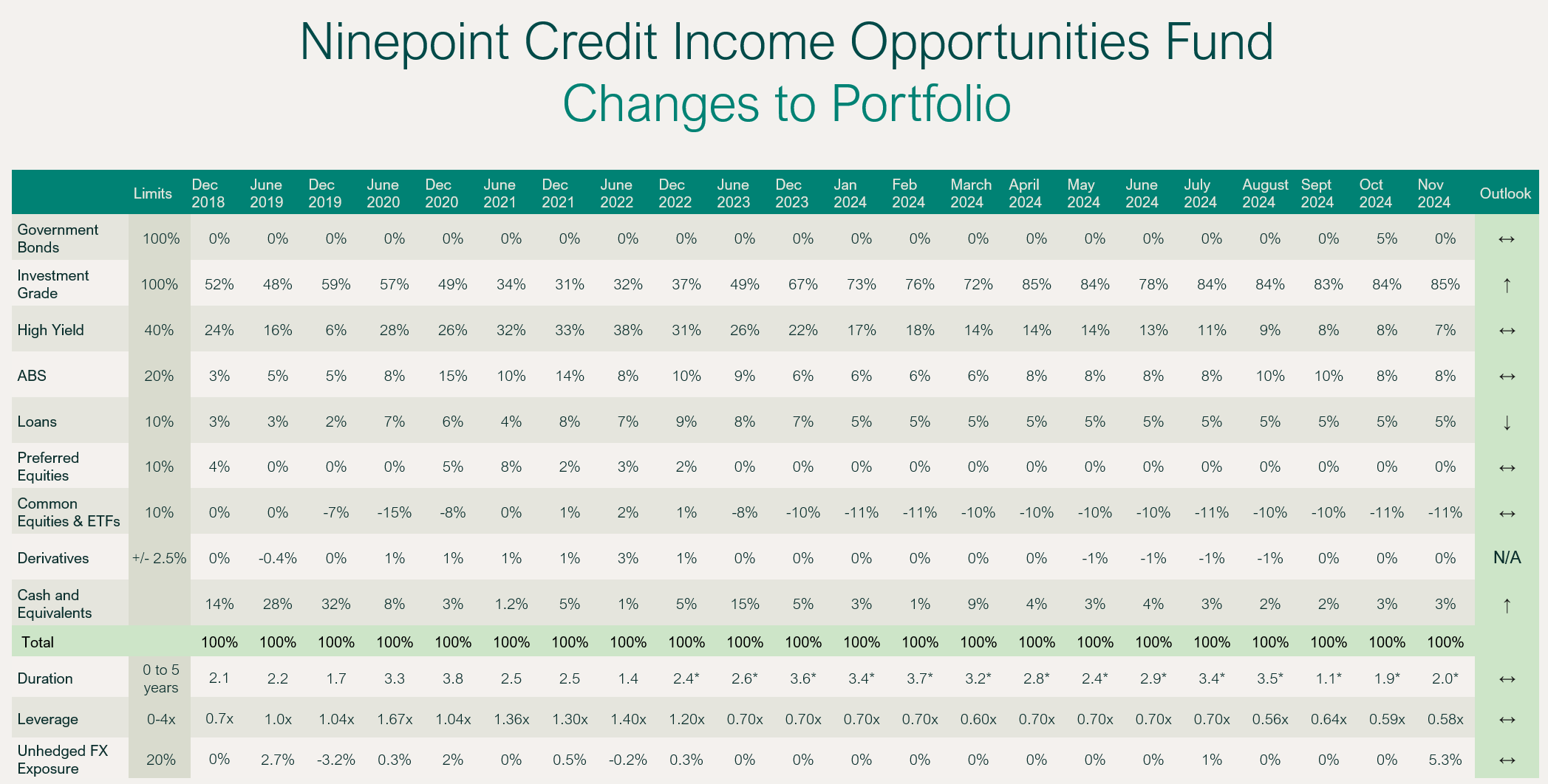 November was a very good month for the fund returning 86 basis points to put the year-to-date number at 7.61%. While we made some changes to duration throughout the Fall, duration was unchanged in November and remains at 3.5 years. The funds yield to maturity declined 30 basis points in November given the aforementioned spread tightening and lower front-end Canada yields and now sits at 5.0%. We have a net 5% position in U.S. dollars. Expect positioning to remain largely unchanged into 2025 as the market slowly calms down heading into the holiday season.