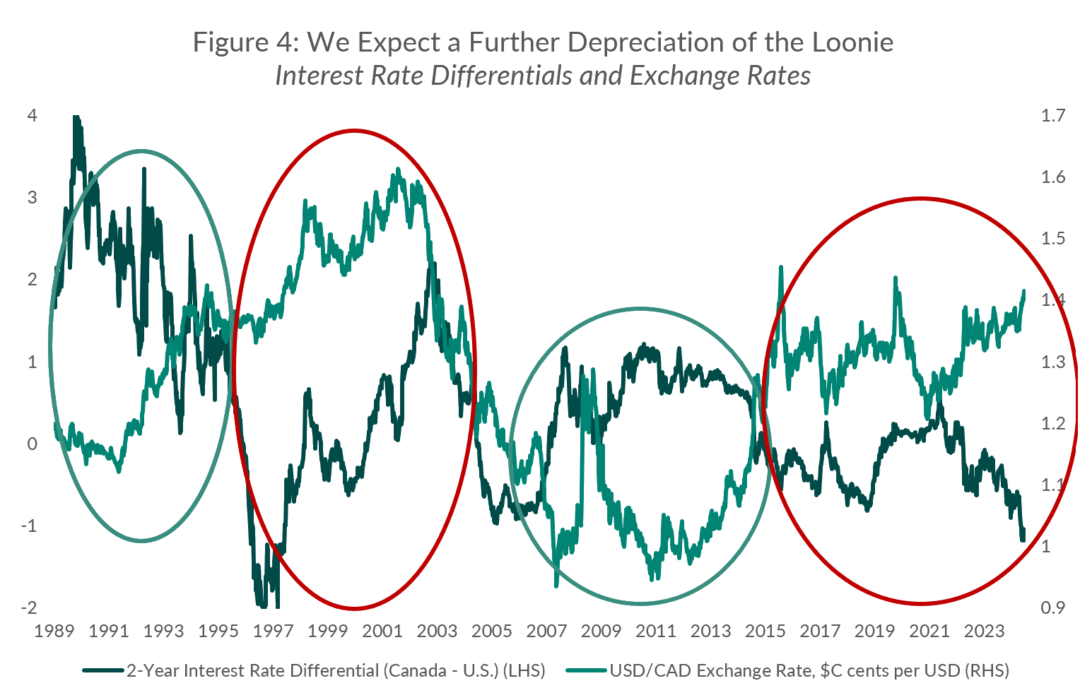 So as discussed last month, we see the Fed and the BoC policy diverging, widening the gap between interest rates here and in the U.S. to levels we haven’t seen in decades. This should put downside pressure on the Loonie, benefiting investment positions there are priced in U.S. Dollars. Figure 4 below shows the historical interest rate differential in Canada vs the U.S. (dark line left axis) along with the exchange rate (light green line right axis, higher is a weaker Loonie).