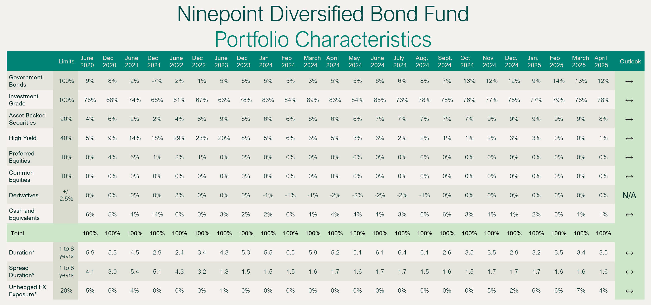 April was a difficult month for everyone, including us. While the fund performed quite well in the first week of the month (rates lower, dollar higher, credit hedges in the money), these factors completely reversed during the balance of the month, leaving us with a small deficit of 26 basis points. We did not make material adjustments to the fund’s positioning, but slightly higher rates in Canada and wider credit spreads left us with a 4.8% yield-to-maturity (from 4.4% the month prior) and a duration of 3.5 years.