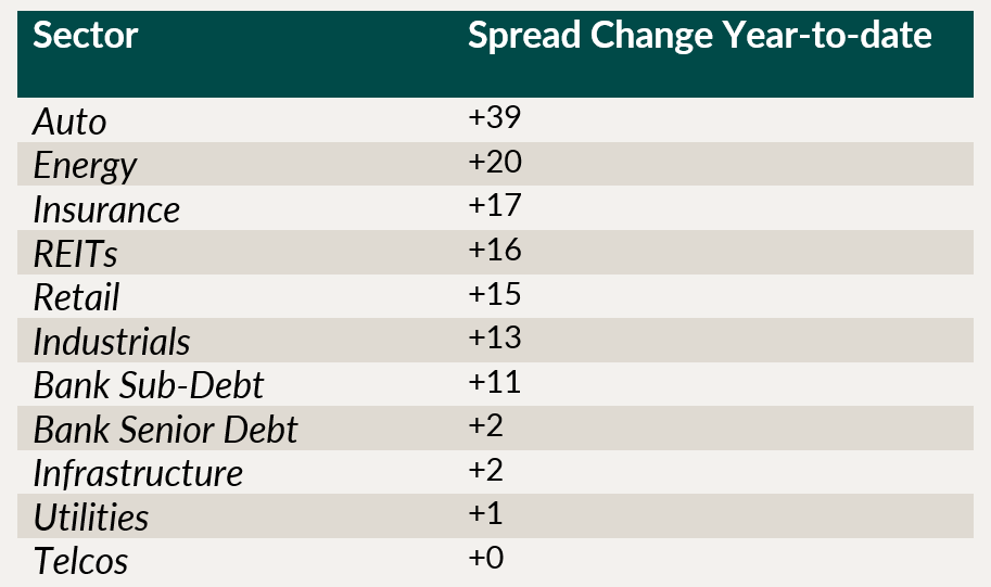 As the U.S. administration has tried to de-escalate their own trade war, we have seen risk assets rebound somewhat, and investment grade corporate credit spreads are now back to where they were pre-“Liberation Day”, and high yield remains a smidge wider. However, under the hood, dispersion across sectors is very high, as shown below, with sectors like autos underperforming materially, while more defensive utilities and infrastructure outperform.