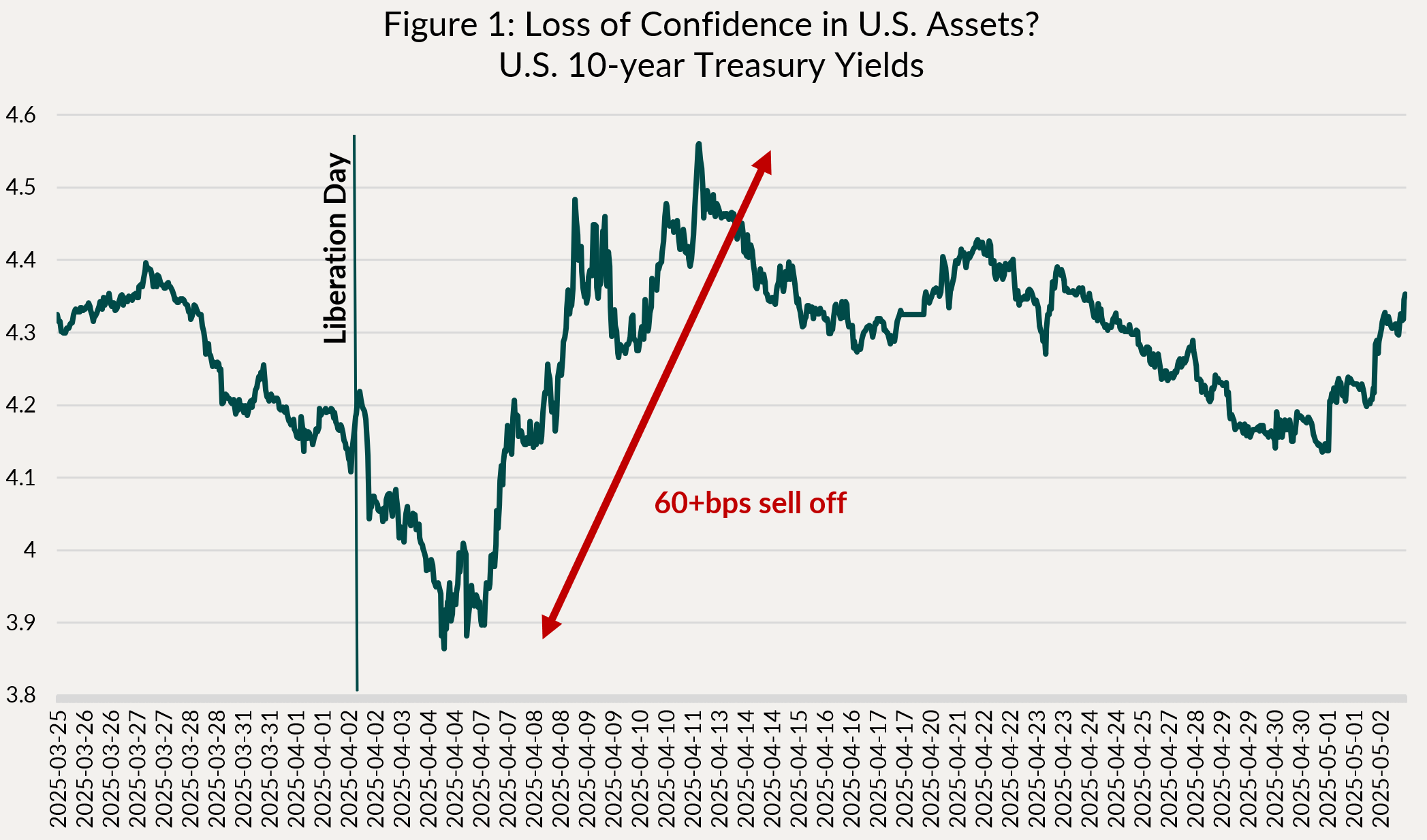 Ahead of April 2nd, we had been preparing our portfolios for a large shock, and markets didn’t disappoint, with risk assets selling off, treasuries & the U.S. dollar rallying. That was the reaction we were expecting to this large negative growth shock, and our funds performed well in that environment. However, the following week, something very peculiar happened. Treasuries sold off massively, from a yield of 3.9% to 4.5% in a matter of days, while at the same time, the U.S. dollar depreciated rapidly (Figure 1 below). Typically, when U.S. interest rates rise, we expect to see a stronger dollar, but this time it was different. Moreover, a lot of this price action happened overnight, during Asian and European trading hours, suggesting that investors from those geographies were involved in most of the selling.