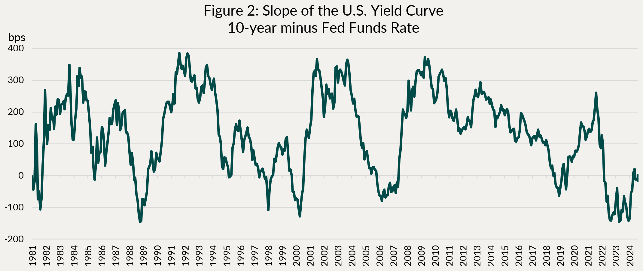 With a debt-to-GDP ratio above 120%, the U.S. Treasury operating with a deficit of 6%+ of GDP, further tax cuts and less demand for U.S. assets, you get a perfect recipe for higher term premiums and higher long-term yields. Since the election of this Republican administration, we have been particularly worried about the fiscal situation of the U.S., and these most recent developments could lead to seismic changes in the slope of the yield curve as investors require greater compensation for lending to the U.S. and for long-term periods. Since the Global Financial Crisis and the beginning of the QE era, the U.S. yield curve has become progressively flatter (Figure 2 below shows the difference between yields on 10-year treasuries and the Fed Funds Rate over time). In the 1990s and 2000s, it wasn’t unusual to see a spread as wide as 350 basis points between the two, peaking just around the time the Fed finishes the rate cut cycle. Given the current situation we wouldn’t be surprised to see the slope of that curve exceed the historic wides.