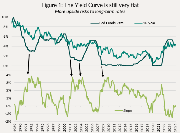 Figure 1 below shows the relationship between the Fed Funds Rate (overnight rate) and the 10-year yield. The top panel shows outright yield levels, and the bottom panel shows the difference (i.e. the slope). At about 5 basis points, the current slope of the curve is still very flat. Historically, we find that the curve is at its steepest right around the end of the rate cut cycle, and often reaches as much as 3-4%. Add that to your target for the Fed Funds Rate at the end of the cutting cycle, and you have a 10-year yield that will likely be above current levels. The same historical relationship holds true for Canadian rates.