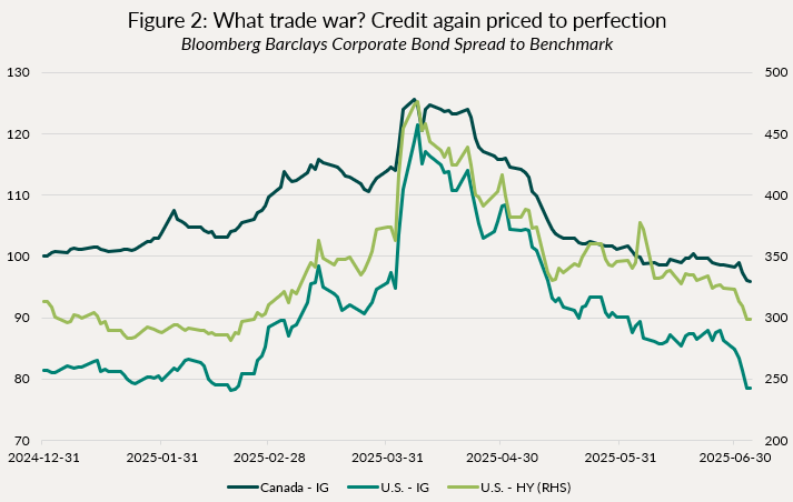 Now for some commentary on the bottom half of the table above, namely the movements in credit spreads and the currency. At the start of the year, we argued that IG and HY credit spreads, on both sides of the border, were priced to perfection, particularly given the dark clouds forming on the horizon over the trade war. Fast forward to today, and credit spreads are tighter than they were at the start of the year, while the trade war is again heating up (Figure 2). Suffice to say, we are, and will remain, in defensive mode with regards to credit exposure. That doesn’t mean that we can’t find attractive securities to add to the portfolios. Our focus has remained on higher credit quality (all funds have an average rating of A-) and shorter credit duration (credit duration ranges between 1.6 and 2.8 years). We want to be able to act from a position of strength when opportunities arise.