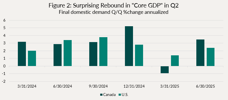 What is creating more uncertainty as to the future path of rates is the rebound we have seen in the second quarter’s final GDP revisions. Despite still elevated and sticky core inflation, if the labour market was weakening at the same time as consumption and investment, it would be a clear signal for the Fed/BoC to cut rates into an accommodative stance. But the economic data is sending mixed signals. Figure 2 below shows what we call “Core GDP” growth, or “Final Domestic Demand”. It takes out inventories and imports/exports to give us a better sense of how the domestic economy is performing. After a sharp contraction in Q1 for Canada and weakness in the U.S., we saw a solid rebound in the second quarter (first estimates were weak, but they got progressively stronger as the data got revised). If this holds for the balance of the year and into 2026, it becomes a lot harder to justify further rate cuts, as this likely means the stickiness in inflation is here to stay.