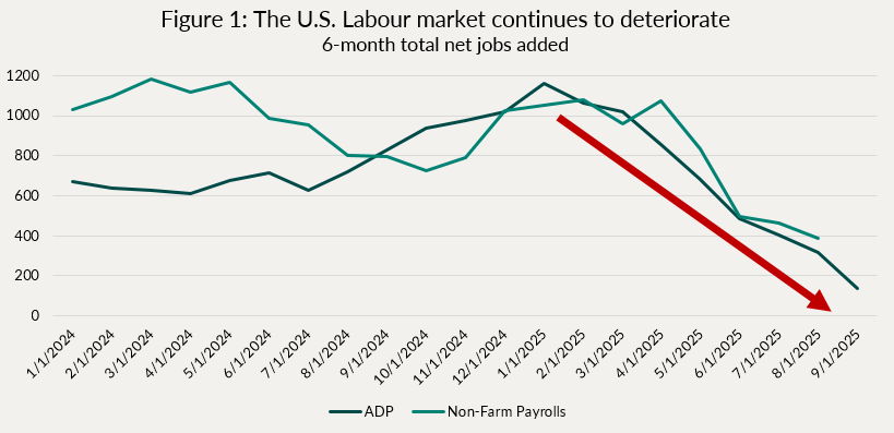 For example, instead of non-farm payrolls (NFP) and the household survey (official Bureau of Labor Statistics releases), the ADP employment report for September was more market moving than usual, despite having been historically dismissed as a poor leading indicator of NFP. For now, it will have to do, since we have nothing else to go by! And, looking at the behaviour of both series over time, it seems like the correlation between them has increased over the past few years, so we shouldn’t be so quick to dismiss the information contained in ADP. Indeed, it shows that the weakness in the labour market is continuing, with a decline of 32 thousand jobs (and the prior month revised to -3 thousand as well), bringing the pace of employment growth at a standstill. To smooth out the month-to-month variations, we show in Figure 1 below the 6-month rolling total net jobs added, based on both ADP and NFP. They are clearly sending a similar message, which justifies this “insurance cut” by the Fed a few weeks ago. Should this continue, we expect the FOMC to keep cutting rates.