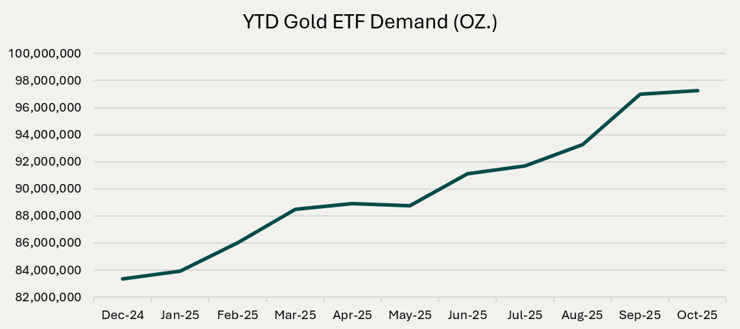 Investor interest in gold has been robust, with both retail and institutional investors increasing their exposure. North American ETF inflows reached $16B in Q3, accounting for 62% of global inflows. Year-to-date, cumulative net inflows hit US$37bn through September. U.S. ETF volumes rose by 59% month-over-month in September, followed by another 51% increase in October, reaching a record US$208bn per day (1,587t), with U.S. ETFs adding 137t in Q3—bringing total holdings to 1,922t (valued at US$236bn in AUM).
