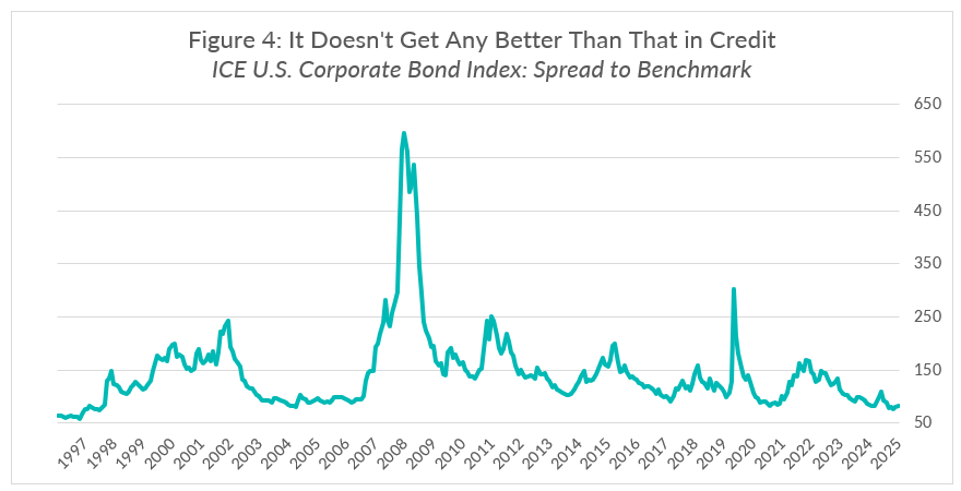 Regardless of the volatility in the month of April, 2025 was a great year for North American credit markets. Credit spreads started the year at multi-decade tights, but still found a way to tighten into year end, driven by an insatiable appetite by investors for corporate bonds. Figure 4 shows historical U.S. IG credit spreads, currently in their 6th percentile.