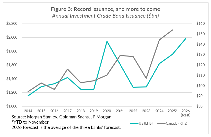 But often, and 2025 was such a year, supply and demand considerations (i.e. what we call technical factors) take precedence. Despite record investment grade (IG) and high yield (HY) issuance in Canada, near record IG issuance in the U.S. (Figure 3 shows historical IG issuance in both markets), demand for credit was so robust that spreads tightened, even to pre-2008 levels in some cases.