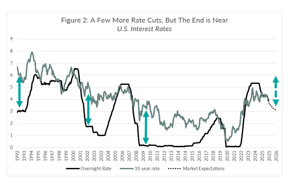 With this most recent monetary cycle, the U.S. is about 6 months behind Canada. Canada raised rates earlier, and started cutting them sooner than the U.S.. And the same lag will be evident when forecasting the shape of their yield curve. The U.S. curve currently remains extremely flat, as shown in Figure 2 above, the Fed Funds rate (the U.S.’s overnight rate) is not that different from the rate on 10-year government bonds. As we approach the end of the rate cut cycle, we should expect the yield curve to re-steepen. Indeed, the last time the Fed funds   terminal rate was at 3% (early 1990s), 10-year rates were oscillating between 5.5% and 6.5%, versus 4.15% today at the time of writing. In other words, even with the Fed cutting overnight rates, our expectations are for term-rates to increase along the yield curve, as they have done for the past several decades at the end of the cut cycle. Therefore, just like in the Canadian bond market, we believe it is prudent to keep U.S. duration low, and wait for better entry points further along the curve, once rates have risen (and bond prices dropped).