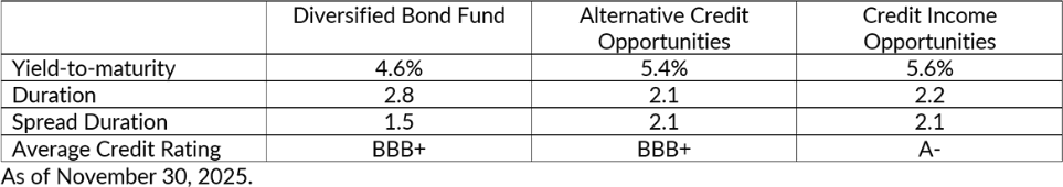 Credit quality remains high, averaging BBB+ to A- (excluding the impact of CDX hedges), while duration and spread duration are at extremely conservative sub-3-year levels. Nevertheless, the funds have yield-to-maturities ranging from 4.6% to 5.6%, which we consider attractive, given how light on risk our positioning is.