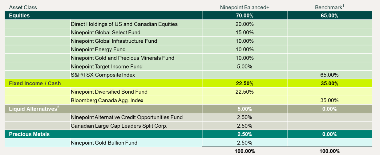Top contributors to the year-to-date performance of the Ninepoint Balanced+ Fund by Fund included the Ninepoint Gold and Precious Minerals Fund, the Ninepoint Energy Fund, and the Canadian Large Cap Leaders Split Corp, while the Ninepoint Global Macro Fund and the Ninepoint Global Select Fund detracted from performance on an absolute basis.
