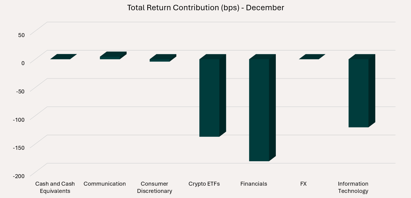 Coming off the heels of November’s intense, broad-based technology selloff, crypto and AI markets delivered mixed performance in December, with just a handful of sector leaders posting modest gains while the broader universe of investable names skewed decisively negative. We believe these drawdowns were partly an extension of November’s cooling, but were also amplified by year-end dynamics, including tax-loss harvesting, profit-taking, and a broader risk-off posture heading into the holiday season. From a sector attribution perspective, there were no material positive contributors during the month. The three largest detractors to Fund performance were Financials (-181 basis points), Crypto ETFs (-137 basis points), and Information Technology (-120 basis points).