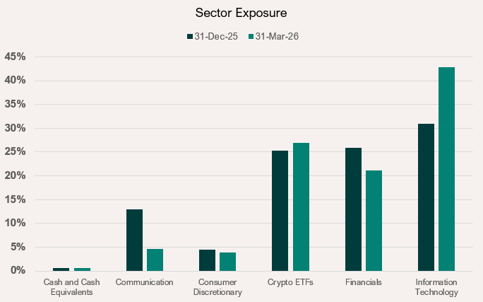 Throughout Q1 2026, we executed several portfolio adjustments to better position the Fund and adapt to the evolving market conditions. At a high level, this involved trimming exposure to Communication and Financials and reallocating that capital primarily into Information Technology. At a more granular level, this activity reflected a reduction in select crypto-related equities, alongside increased allocations to both existing and new positions in high-performance compute (HPC) infrastructure companies.
