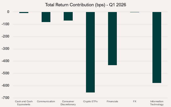 From a sector attribution perspective, there were no material positive contributors in Q1 2026. The three largest detractors to Fund performance were Crypto ETFs (-655 basis points), Information Technology (-577 basis points), and Financials (-433 basis points). On an individual position basis, the largest detractors were Bitcoin (-350 basis points), Ethereum (-193 basis points), and Robinhood (-177 basis points). The decline in spot crypto asset prices and the corresponding impact on crypto-related equities were the primary drivers of the Fund’s negative performance. To be sure, the Fund is structured with a maximum allowable allocation of 30% to crypto assets to help mitigate concentration risk, a threshold we remained well below throughout the period, which did help moderate the overall impact.