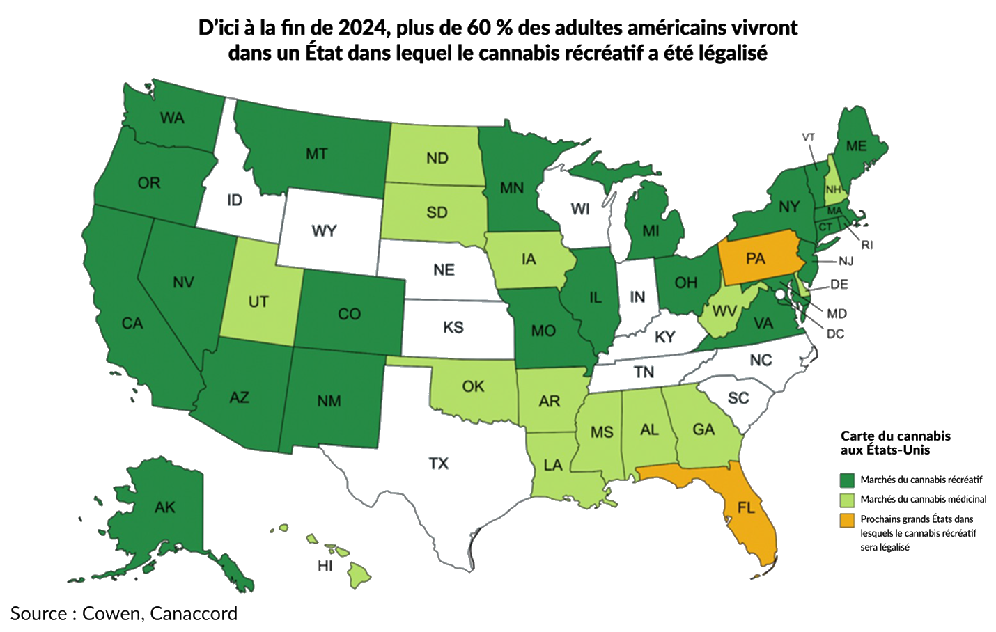 Ce serait également important pour rallier un soutien à l’échelle nationale concernant la réforme fédérale du cannabis, étant donné que la Floride est un État contrôlé par les républicains et qu’il est limitrophe de nombreux États qui ont instauré des programmes restrictifs ou limités de cannabis médicinal. Des États comme l’Alabama, la Géorgie, le Mississippi et la Louisiane verront probablement des conducteurs traverser la frontière pour acheter du cannabis interdit dans leur État d’origine. Nous avons constaté ce phénomène dans le New Jersey, où les consommateurs viennent en voiture de New York ou de Pennsylvanie. Nous avons également observé des ventes similaires dans l’Illinois, où les consommateurs font le voyage depuis l’Indiana, le Missouri, le Wisconsin et l’Iowa. Plus important encore, le fait d’avoir un voisin qui vend légalement du cannabis récréatif pourrait changer la nature du débat sur cette substance dans ces États, face à la perte des recettes fiscales et à la constatation par les électeurs de l’existence d’un marché opérationnel du cannabis récréatif à proximité. Au-delà de l’avantage évident qui découlerait de l’accroissement de la taille du marché, le fait que ces États profondément républicains deviennent plus favorables au cannabis améliorerait les chances d’une réforme fédérale supplémentaire.