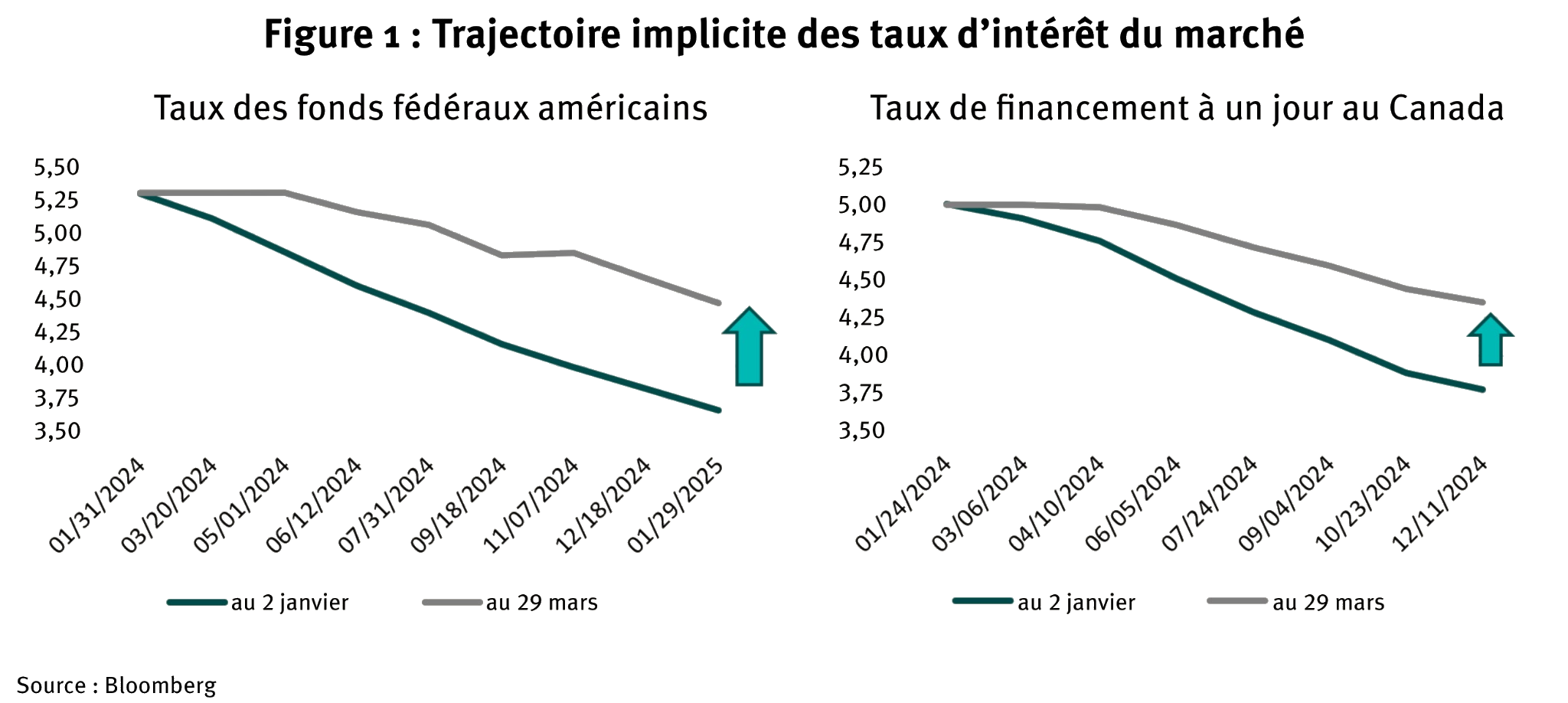 Après l’emballement concernant les baisses de taux qui a marqué le début de l’année, le sentiment du marché est revenu au point de départ, escomptant des baisses de taux moins nombreuses et beaucoup plus tardives (figure 1).